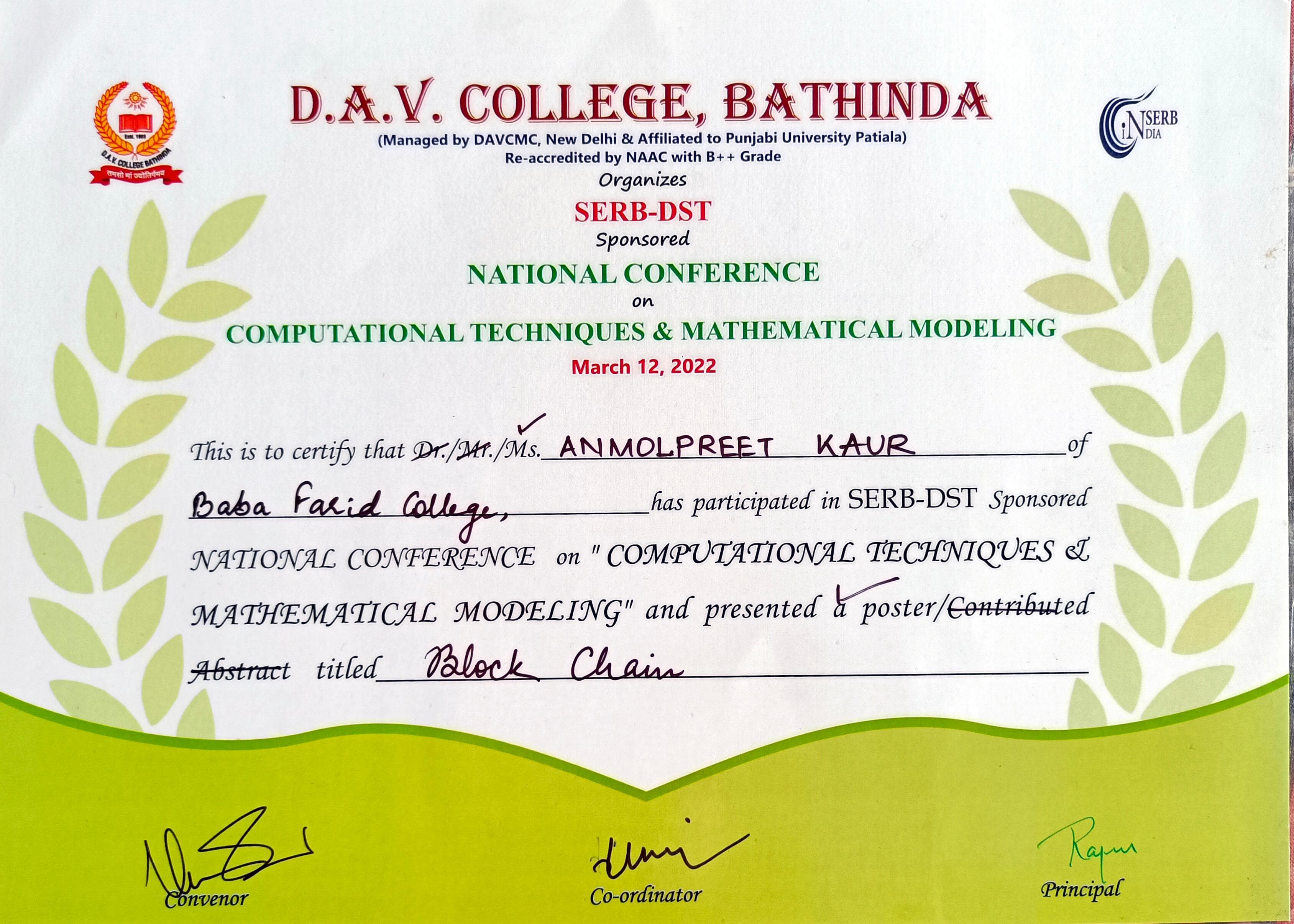 - Participant in SERB-DST sponsored NATIONAL